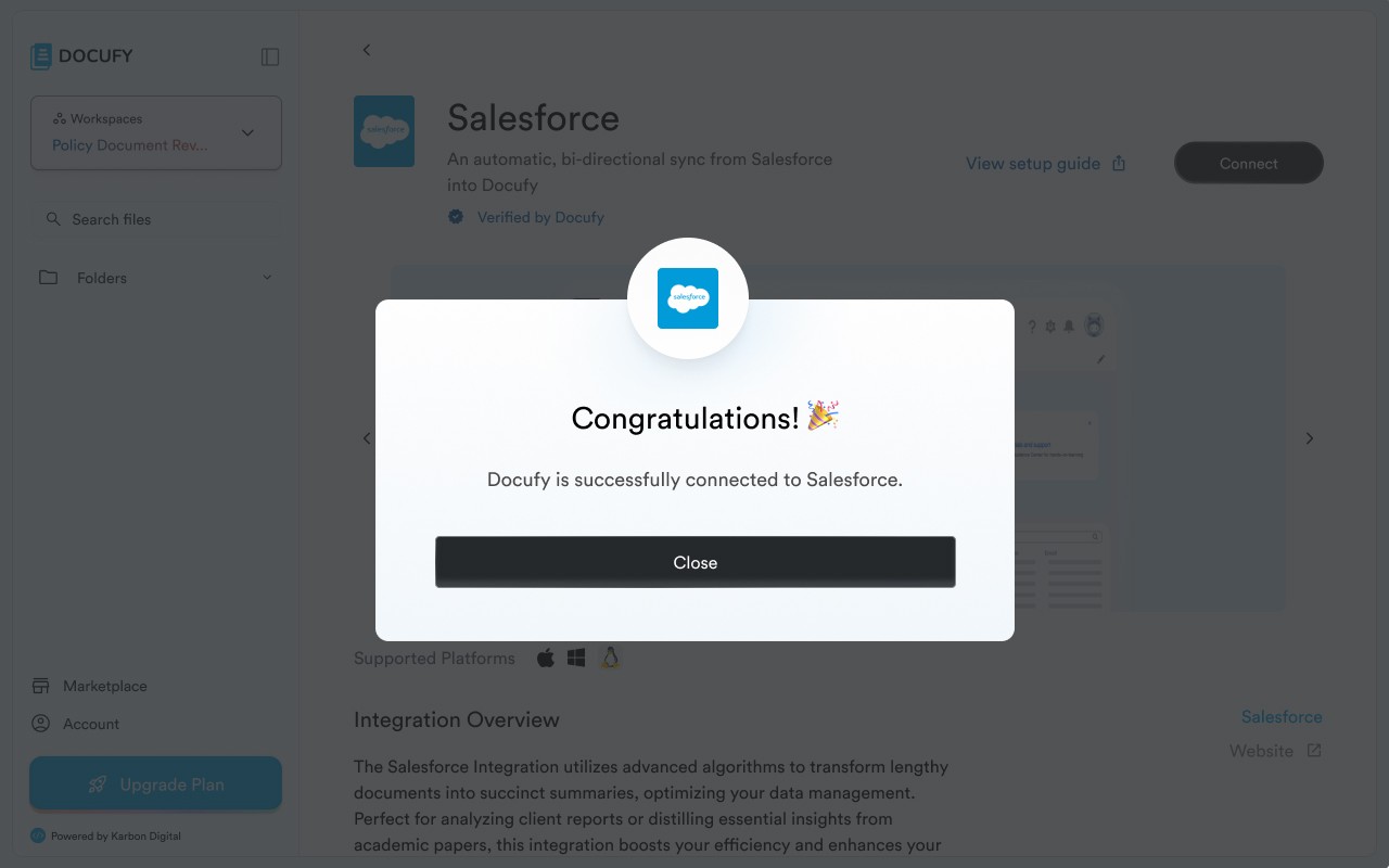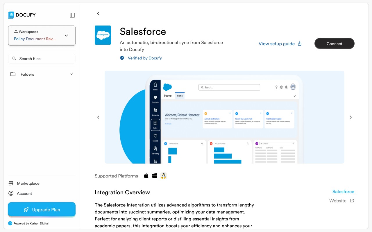 Read the Integration Overview section carefully before connecting — it explains exactly how Docufy syncs data with the platform and what permissions are required.
