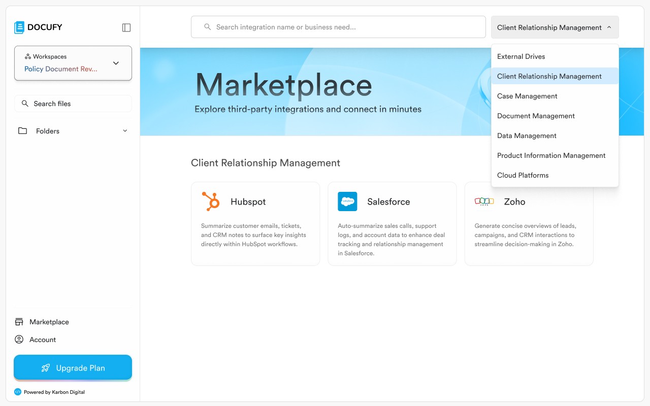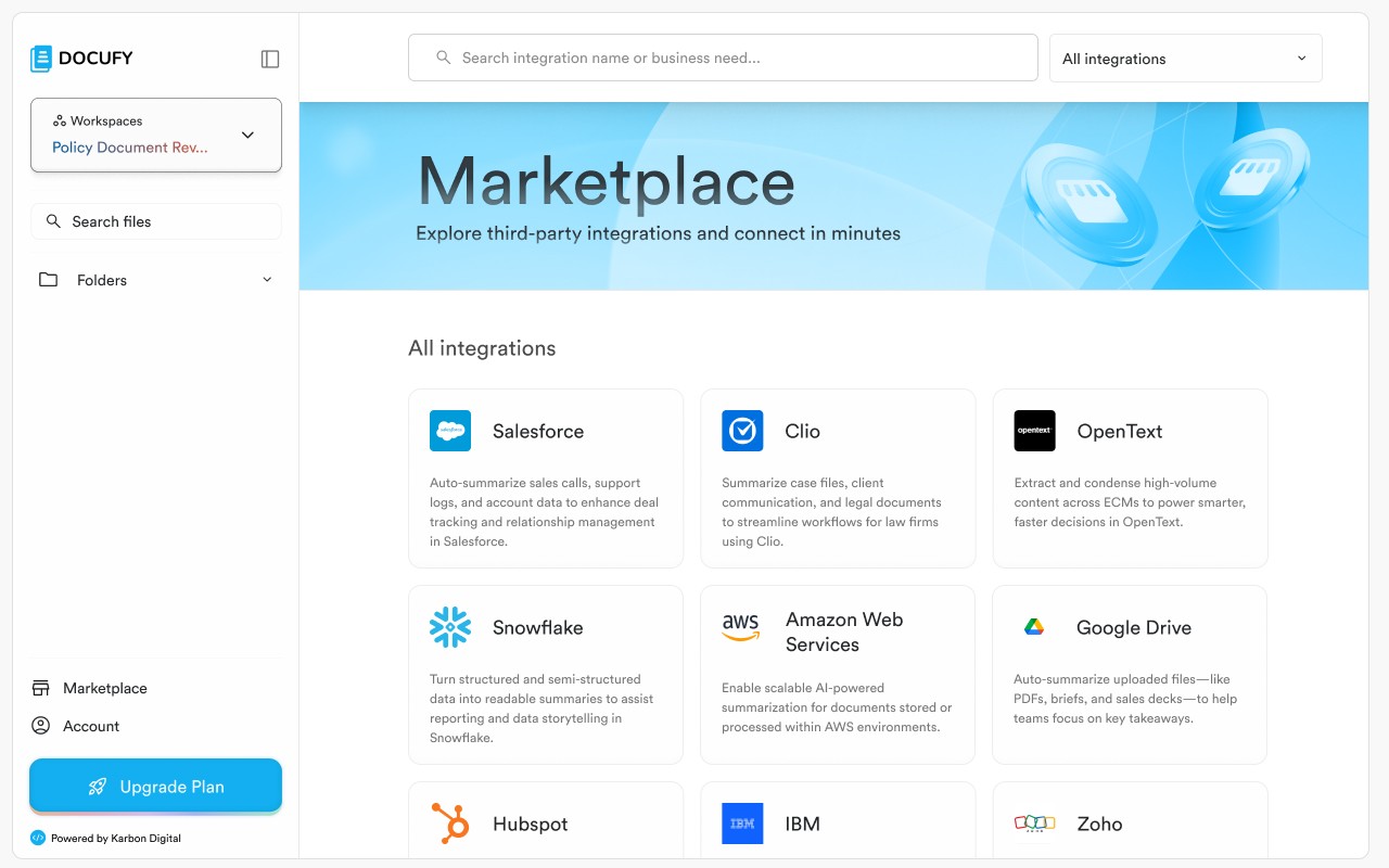 The Marketplace landing page shows every available third-party integration Docufy supports. Use the search bar or the category filter to find the platform you need.