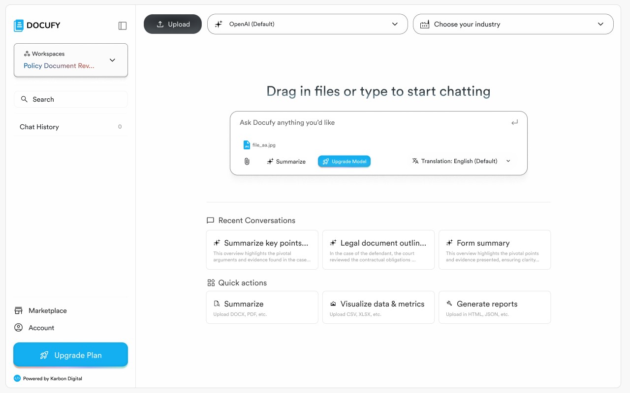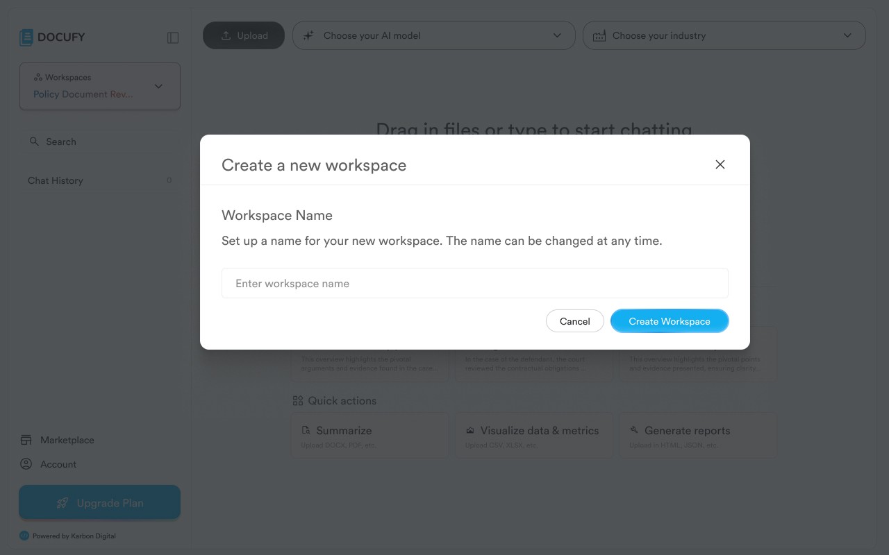 After creating the workspace, Docufy loads the empty-state landing screen. From here you can immediately start a conversation, upload a document, or pick a quick action.